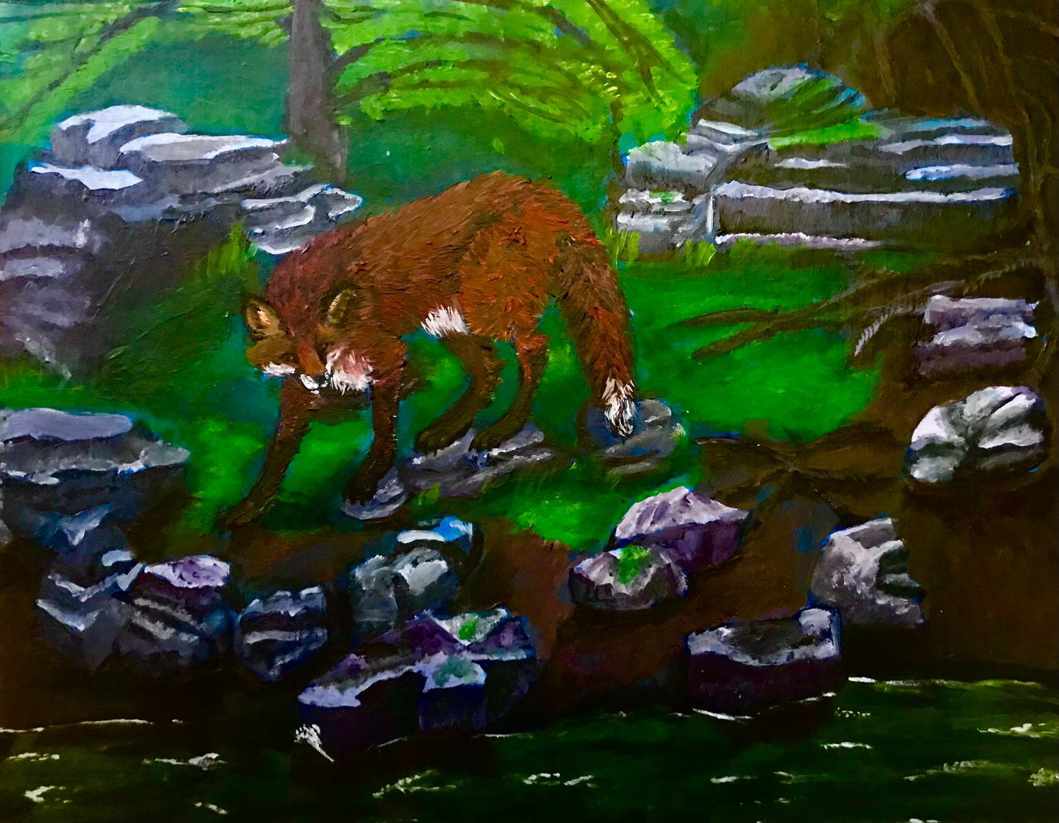 "Independence" | painted years ago. I was in a relationship where I was the primary earner. I worked two jobs at one point. Took out payday loans, all to keep us afloat because he did not financially support us. It wore me out. Each new day was a trial. So I painted this solitary fox: the first painting ive done in years up until then. While I was in constant company I felt alone more than anything, I also felt pressured to take the next step in life. I recognized I had the power to chance my setting completely by leaving. Hence why the fox looks back where stepped, but with one foot forward. Hindsight really is always 20/20.