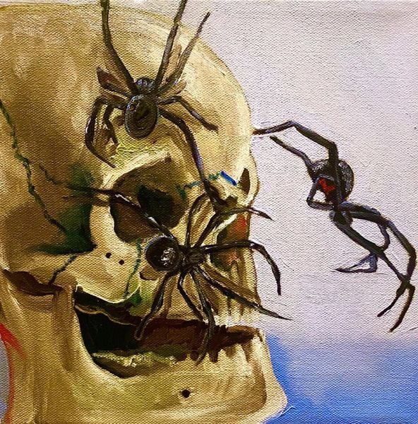 This idea was conceived during a heartbreak. Not just romantic. Alcoholism has poised loved ones the earliest in my life. My parents both sloppily hid, but I expertly overlooked their addictions. As an adult, I have seen countless friends and sparse lovers become lost in drinking. I feel if I had wanted, I could have succumbed to it. So the black widows, three of them, represent the complete, half, and new moon. Maiden, to crone. They are occupying the cranium that has been discarded. They also directly relate their venom to the poison voluntarily filling our minds. I condensed my precise feelings into this poem: